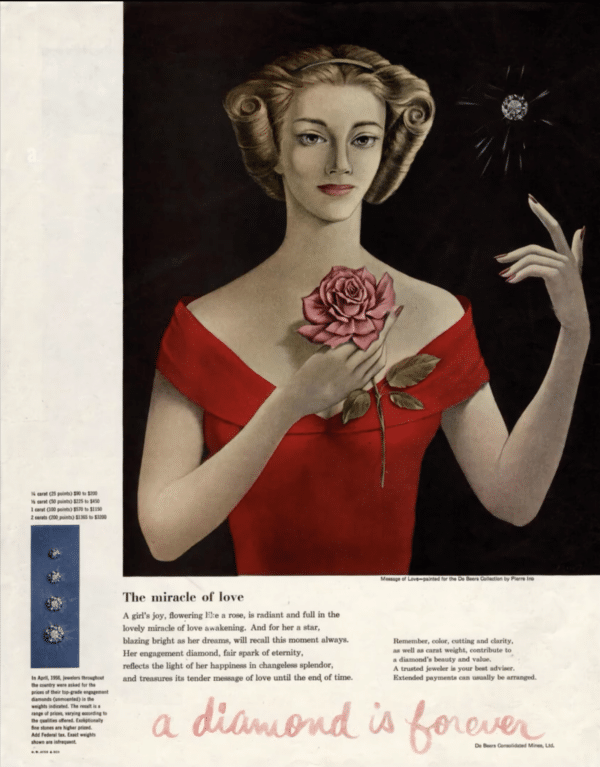 Todd Liles: That’s awesome. Thank you. In today’s ad segment, we’re gonna unpack one of the most famous print media campaigns ever, and it’s De Beers’ A Diamond is Forever. This campaign didn’t just sell diamonds. It created a cultural expectation around them, changing the way the entire world thinks about engagement rings. Okay, Roy, so today, in honor of it being my 24th wedding anniversary…