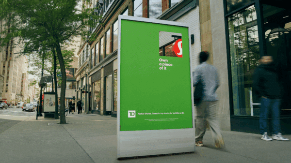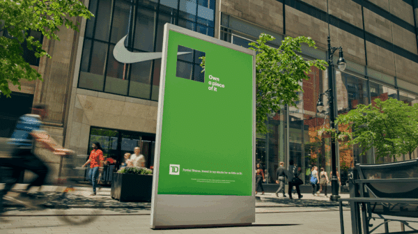 A couple of things. This is an ad for the concept of fractional shares, which can be a difficult idea to explain. When TD started this advertising, TD was the first to offer fractional shares. Basically, what a fractional share means is you don’t even have to buy a full share. So, in other words, if the share is trading for $200, and you only got 20 bucks to invest, you can literally buy a small piece of a share, which also means you’re speaking to a lot of new investors. So how do you reach them? So they suddenly realize, great, wait, look, we all do stuff outdoors. So they wanted to reach them through outdoor advertising, through billboards,